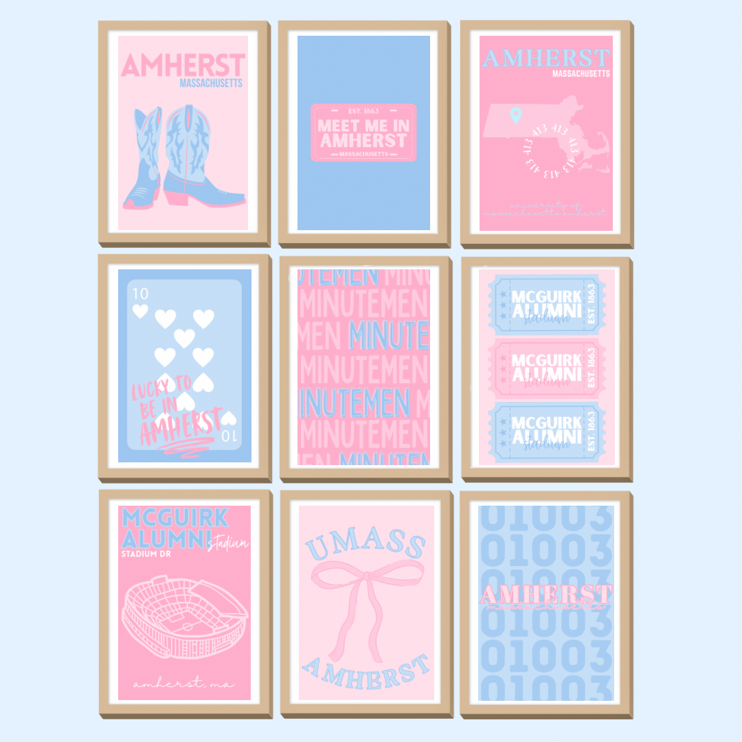 Set of 9 Custom College Digital Wall Prints - University of Massachusetts at Amherst (UMASS), Amherst